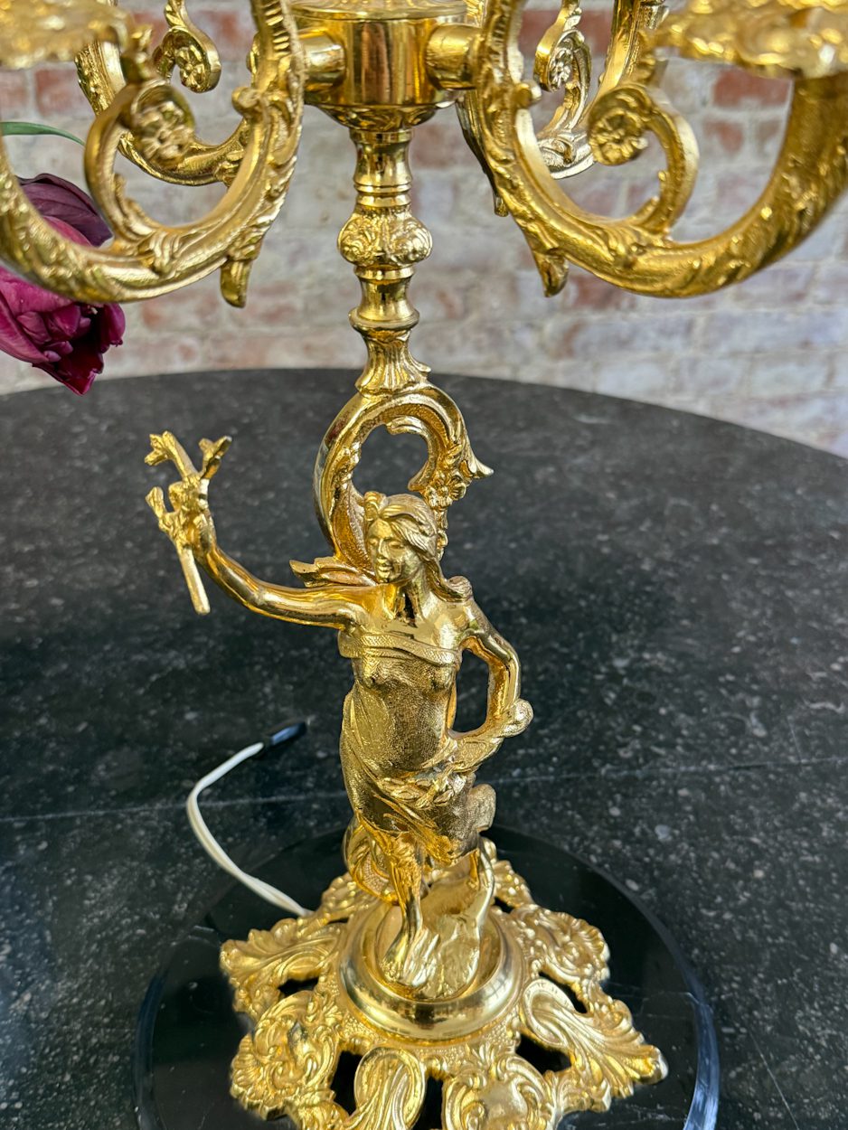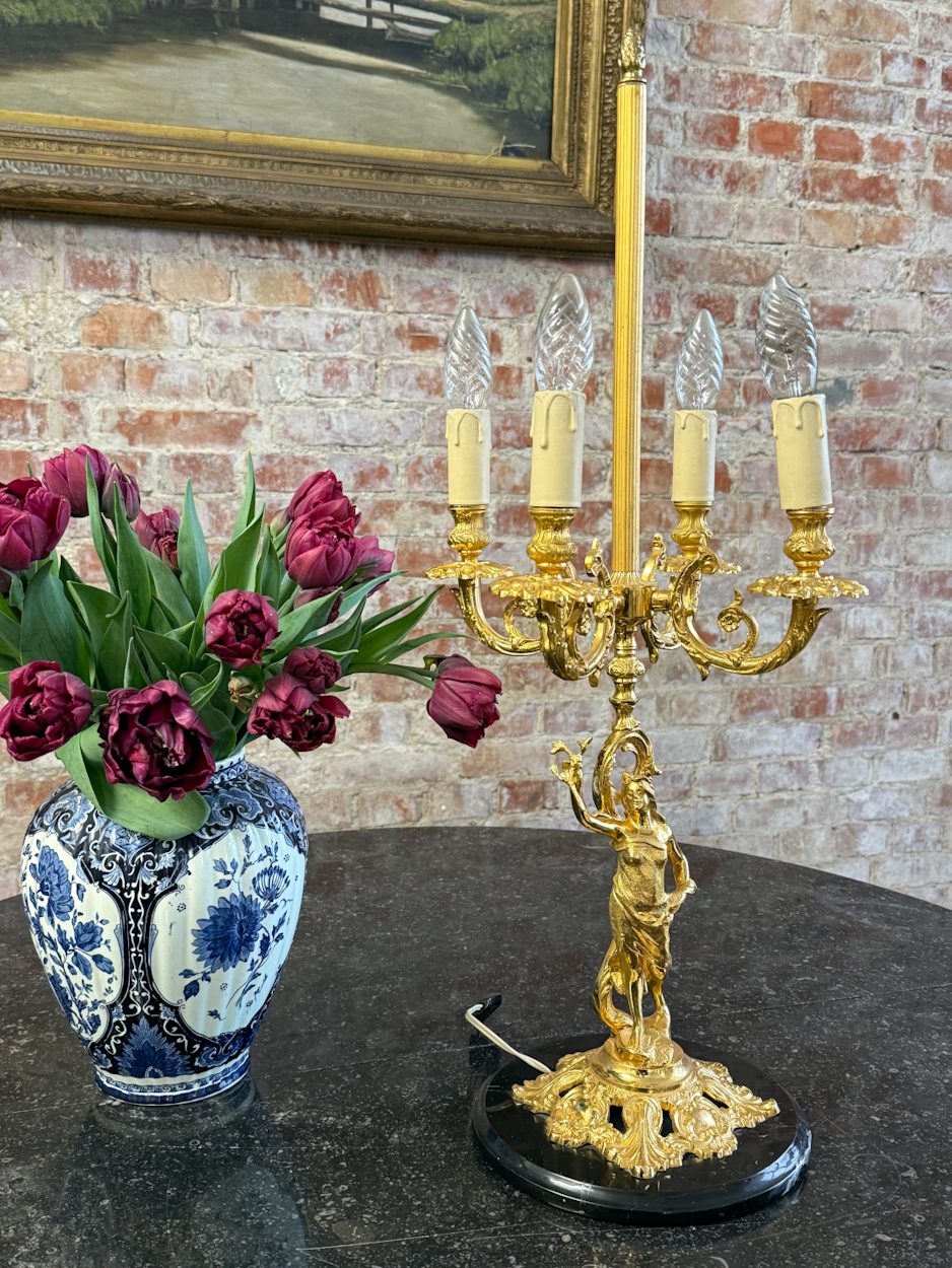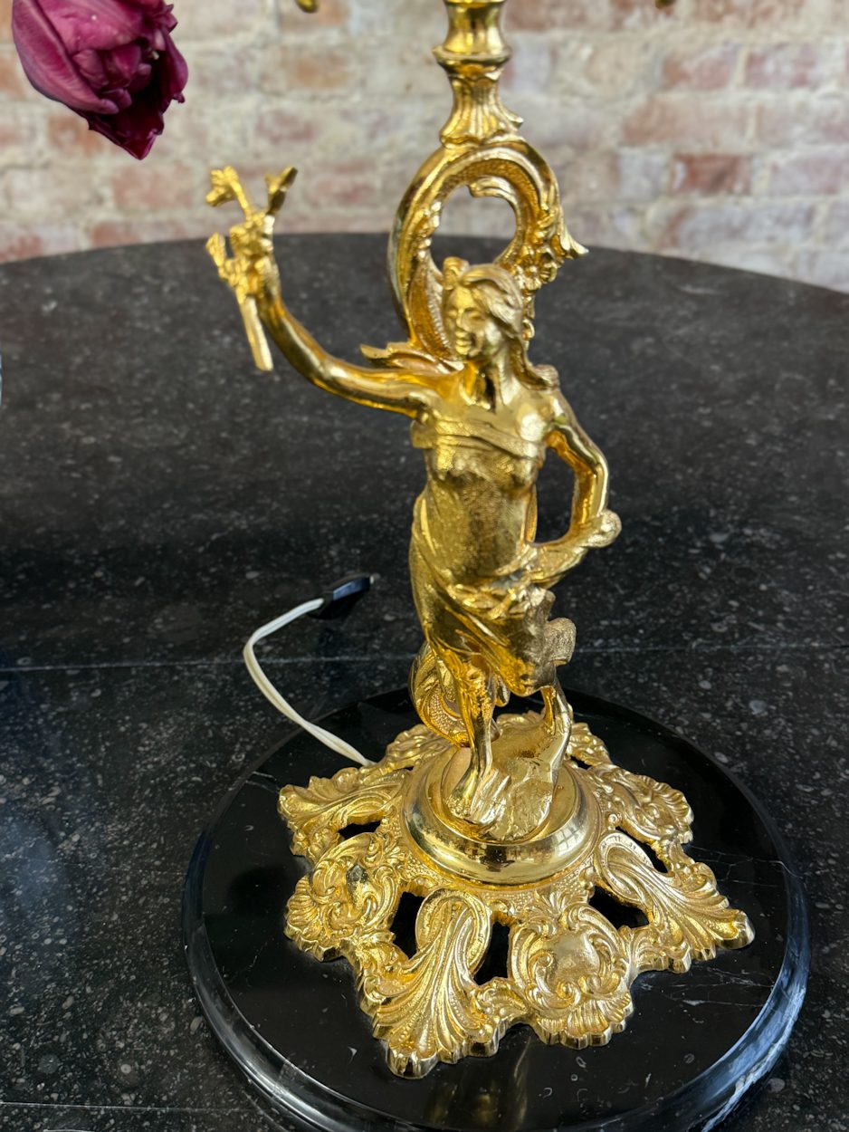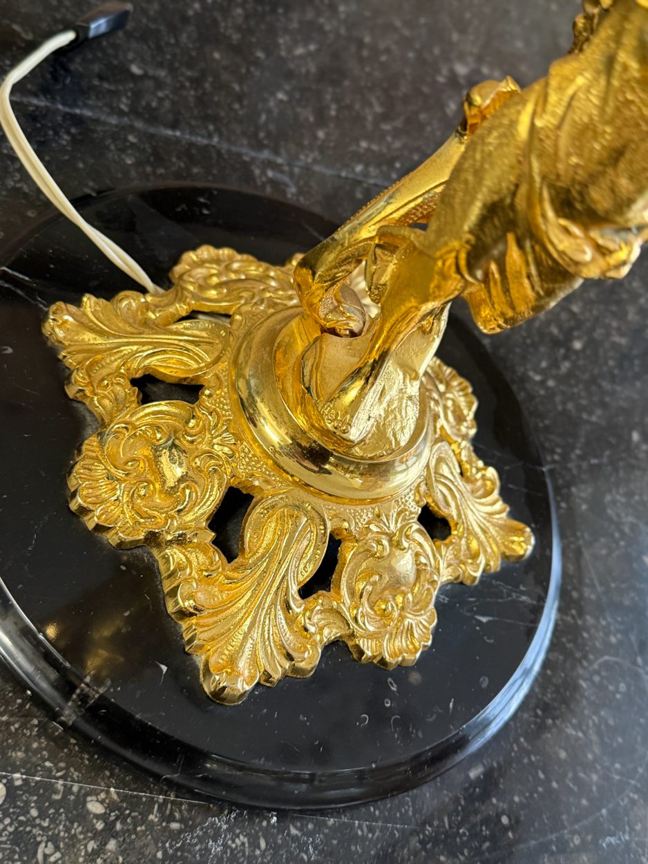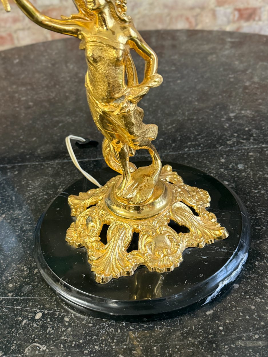 galda lampa ar sievietes figūru, spīdīgā zelta krāsā, pamatnē melns marmors, vidēja izmēra, 4 spuldzēm (6391)