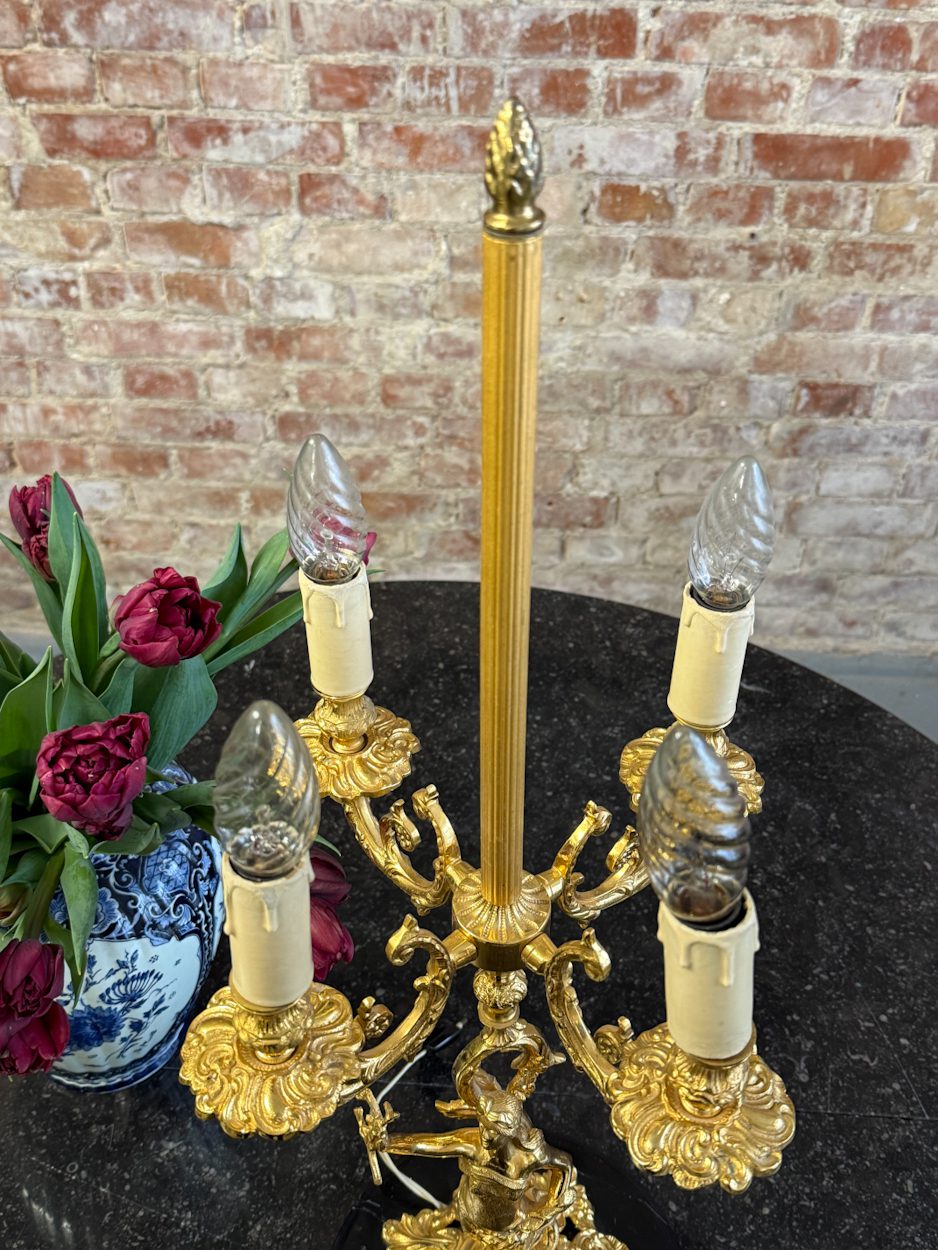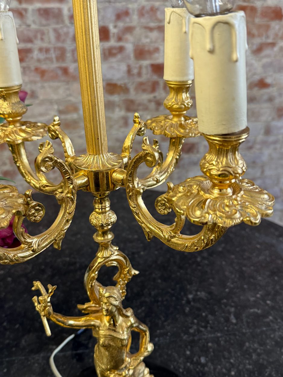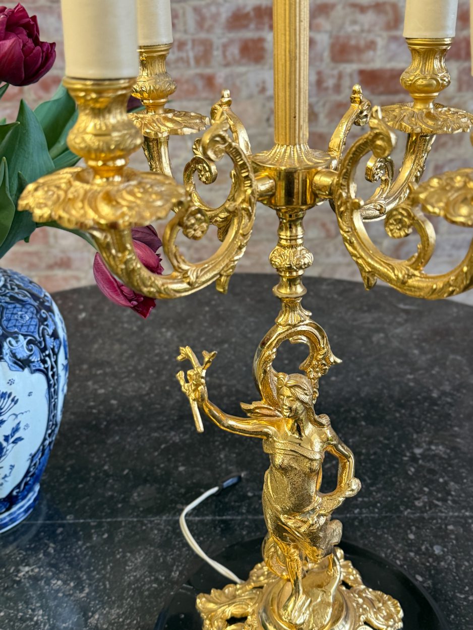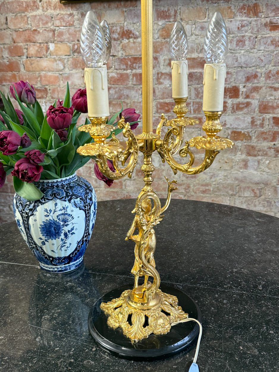 galda lampa ar sievietes figūru, spīdīgā zelta krāsā, pamatnē melns marmors, vidēja izmēra, 4 spuldzēm (6391)