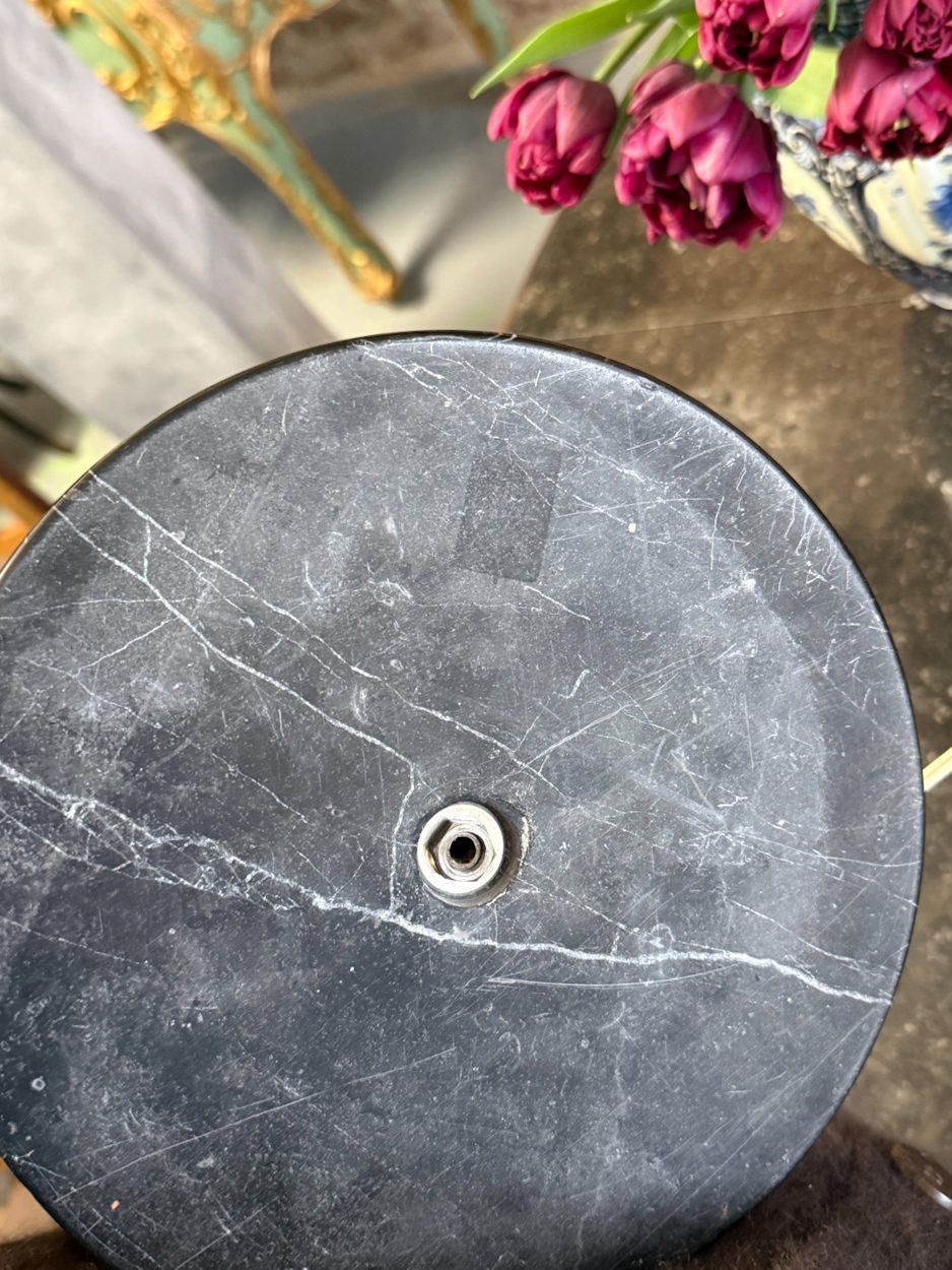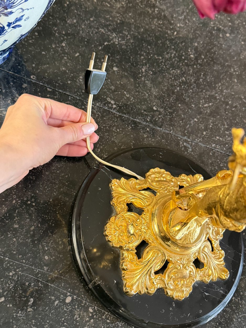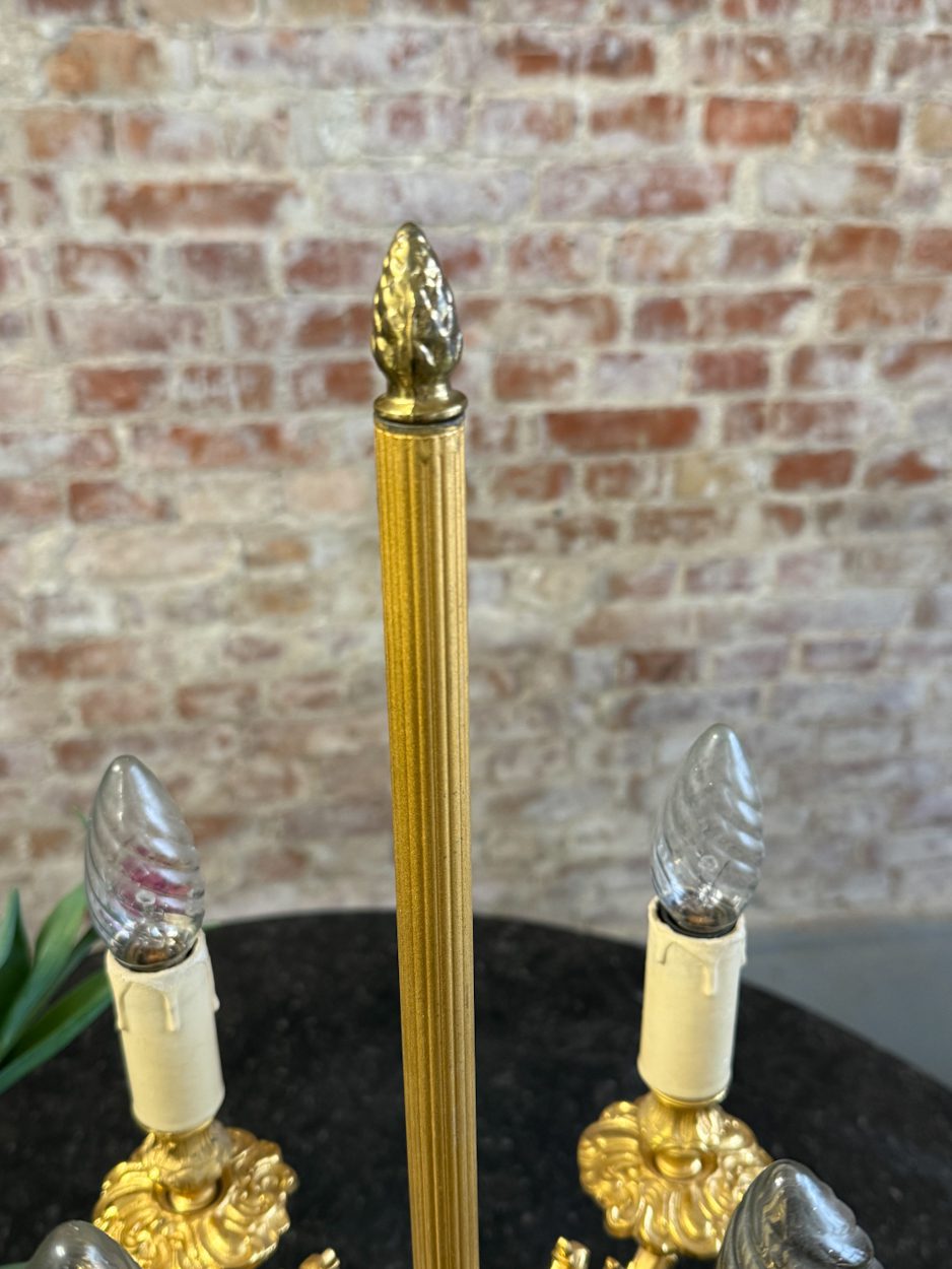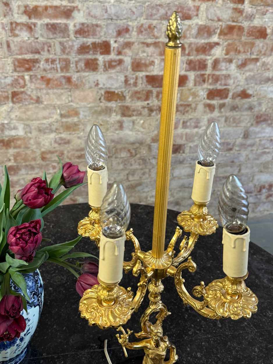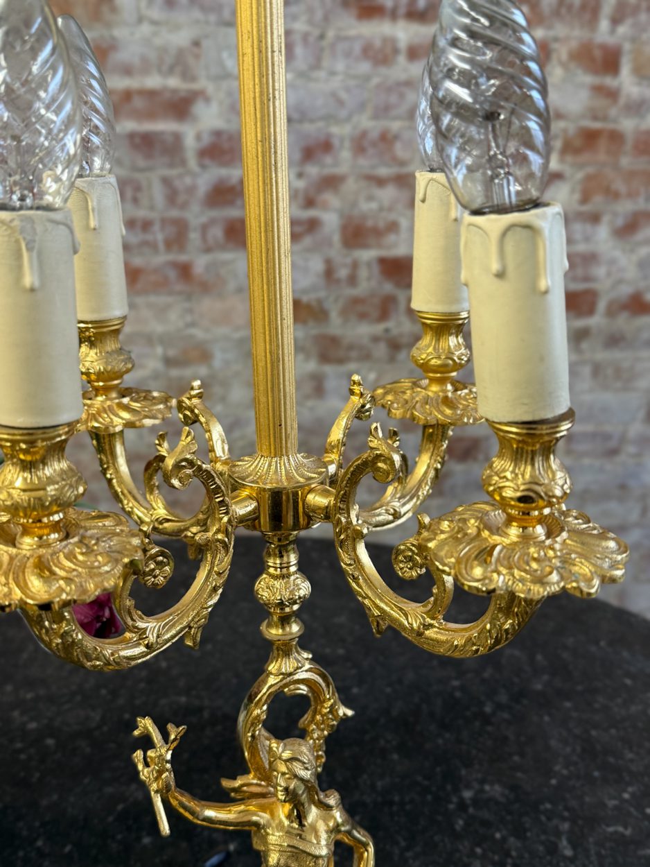 galda lampa ar sievietes figūru, spīdīgā zelta krāsā, pamatnē melns marmors, vidēja izmēra, 4 spuldzēm (6391)