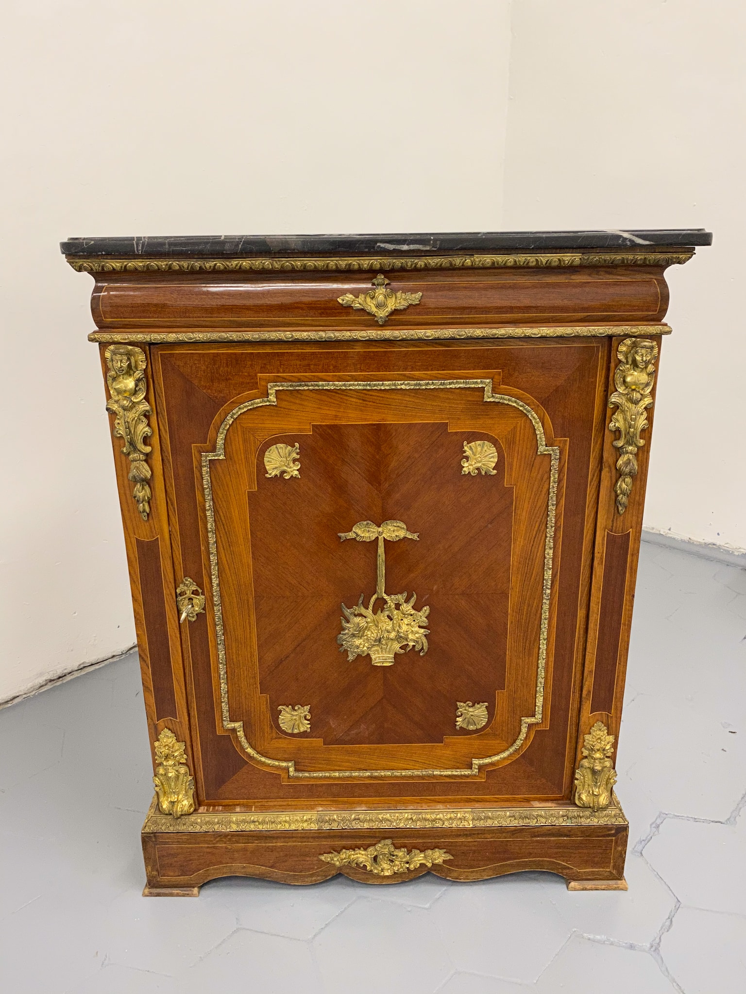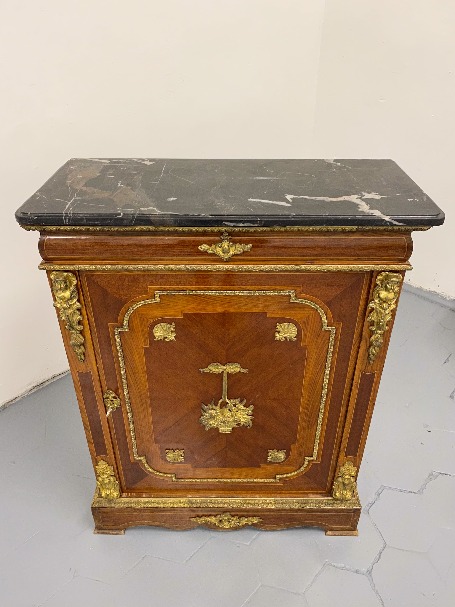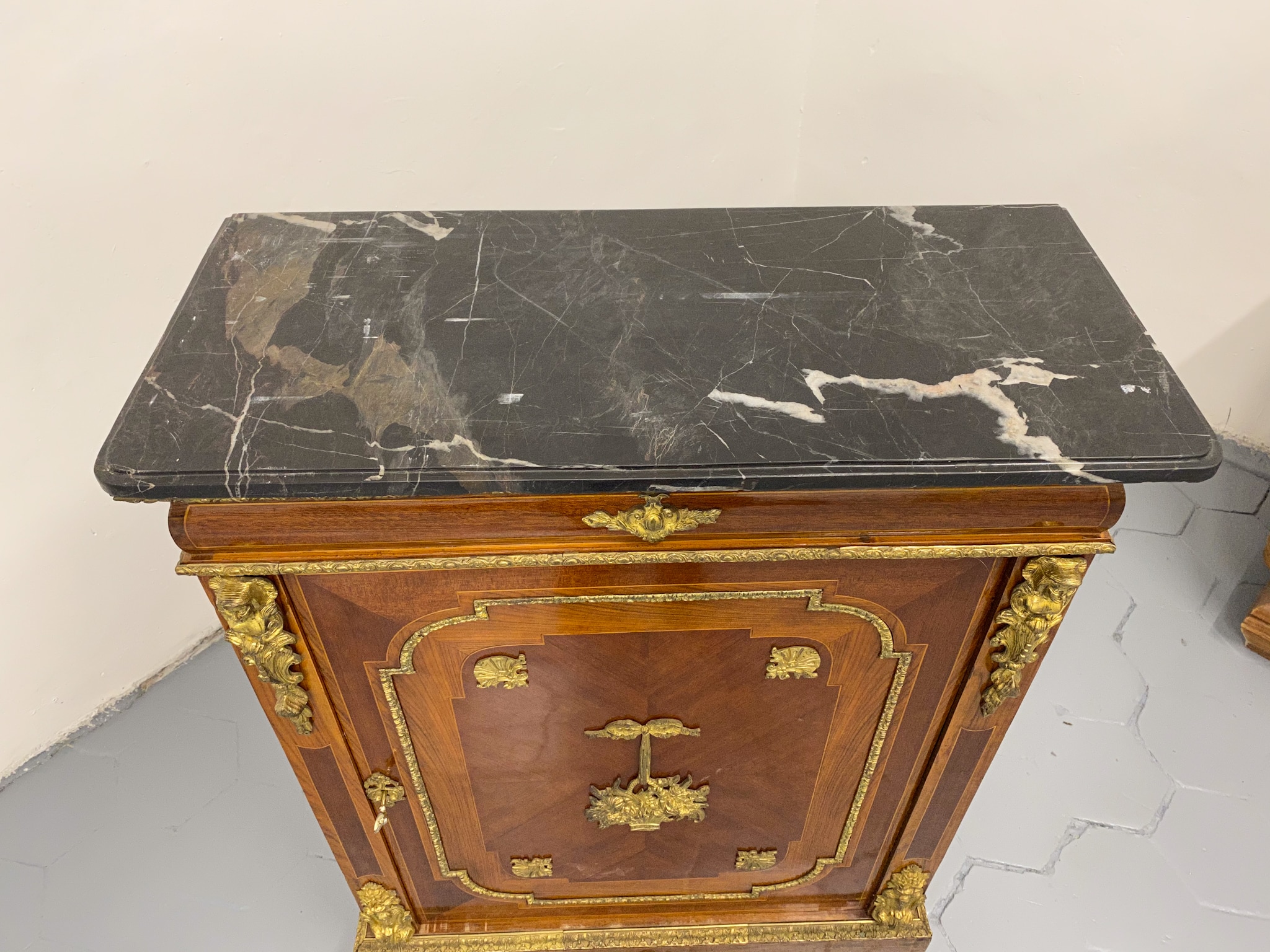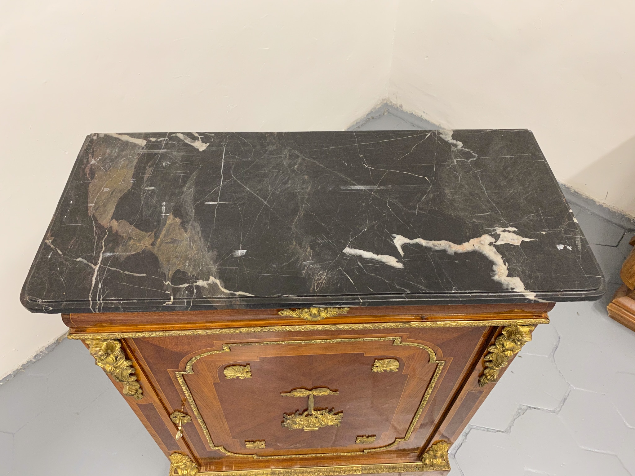Grezna, koka kumode ar bronzas detaļām un marmora virsmu (2281)
